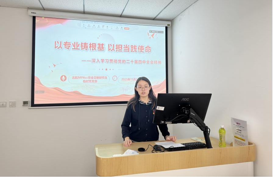为深入学习贯彻党的二十届四中全会精神,引导研究生党员筑牢思想根基、强化使命担当,近日,北京航空航天大学2025级MPAcc非全日制研究生临时党支部在新主楼A1036室召开专题党课学习,2024级临时党支部线上参加。